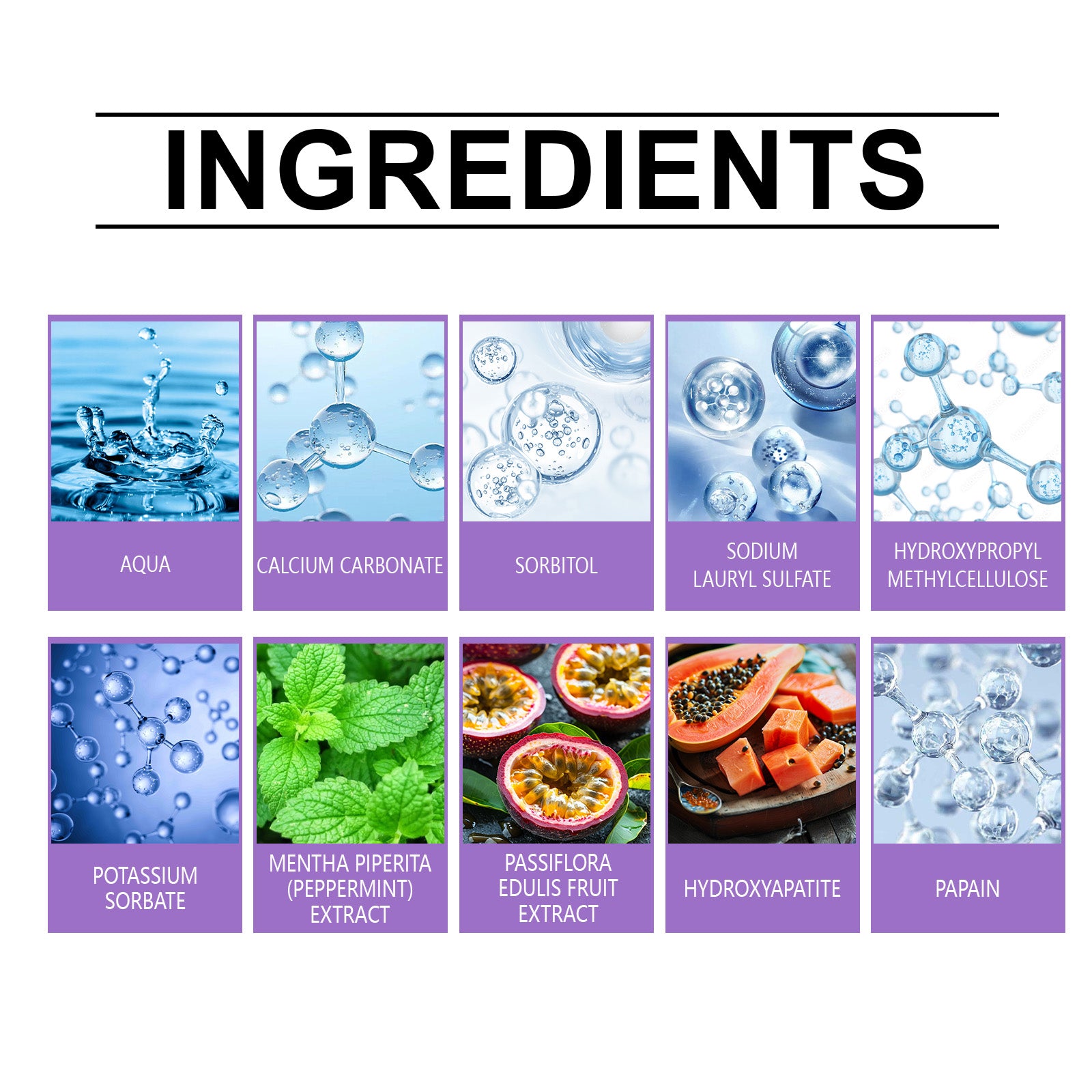 🛡️ Enamel Repair & Strengthening: Hydroxyapatite, a key component similar to natural tooth enamel, helps repair micro-scratches and maintain a smooth, strong tooth surface.